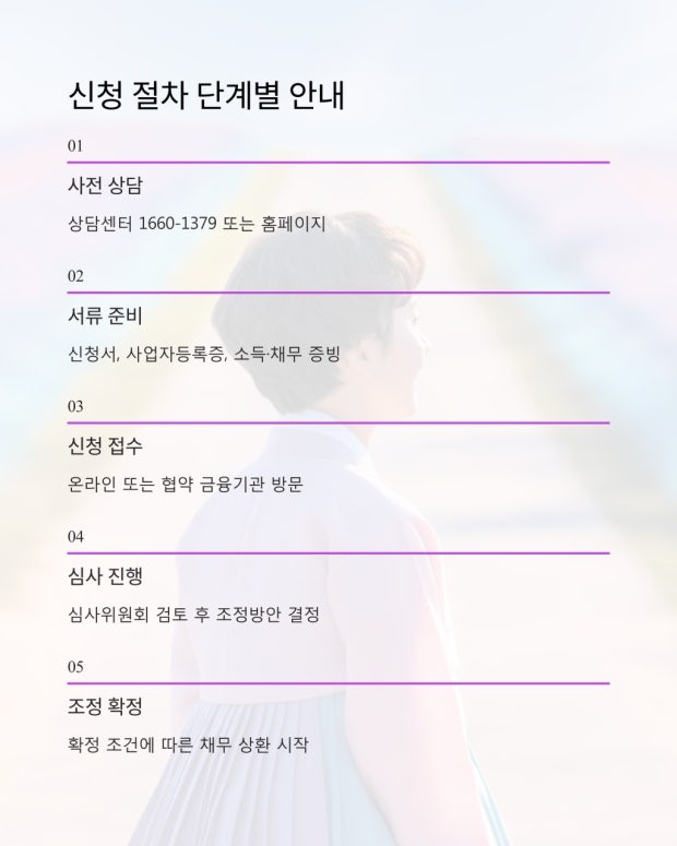 - 약정 체결 및 조정 — 채무조정 조건(거치·상환기간, 원금감면 등) 확정
