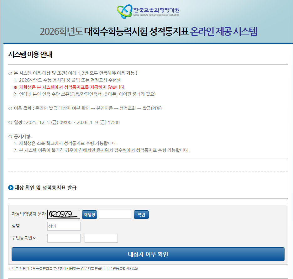 - 한국교육과정평가원 접속 → ‘수능성적 조회’ 메뉴 클릭